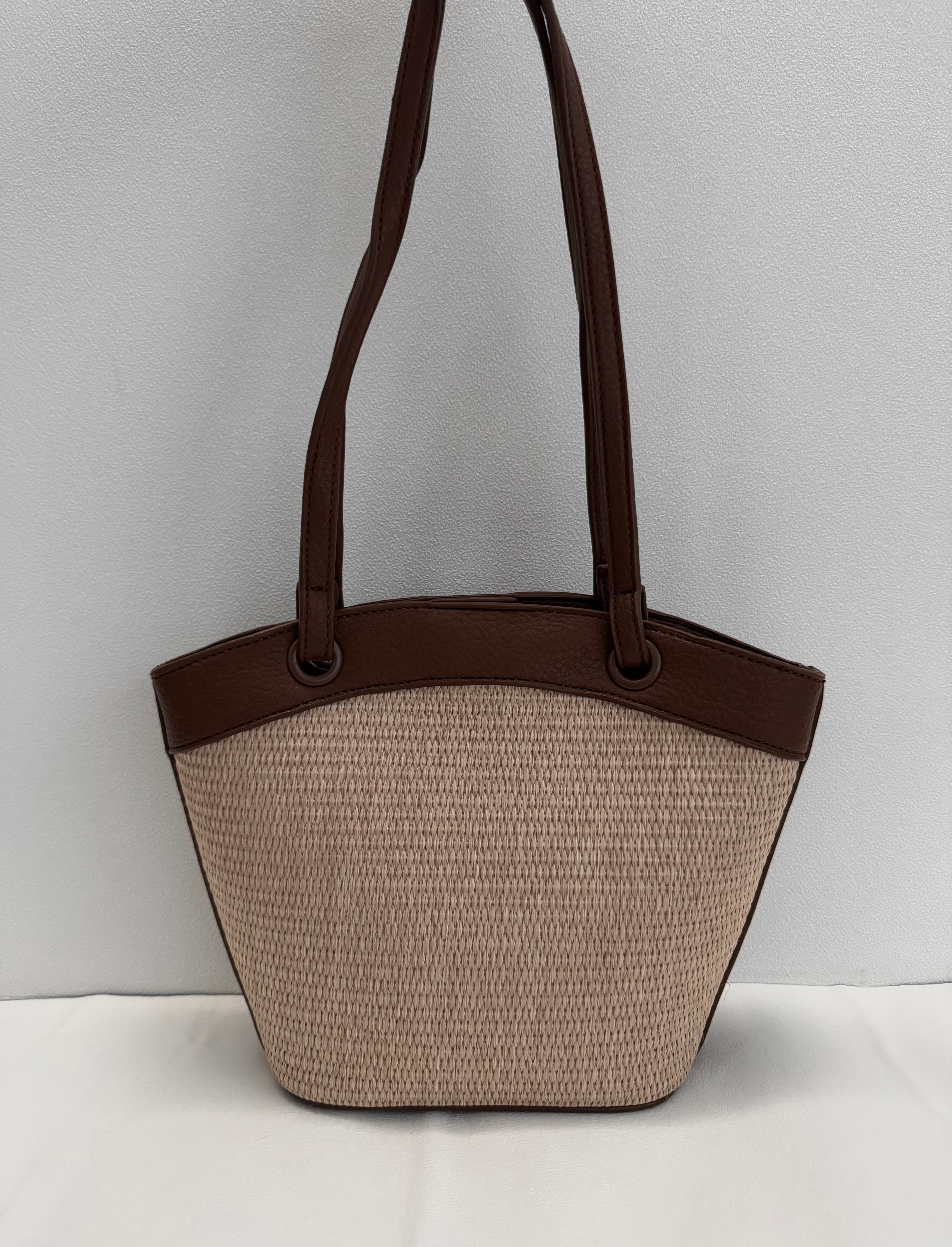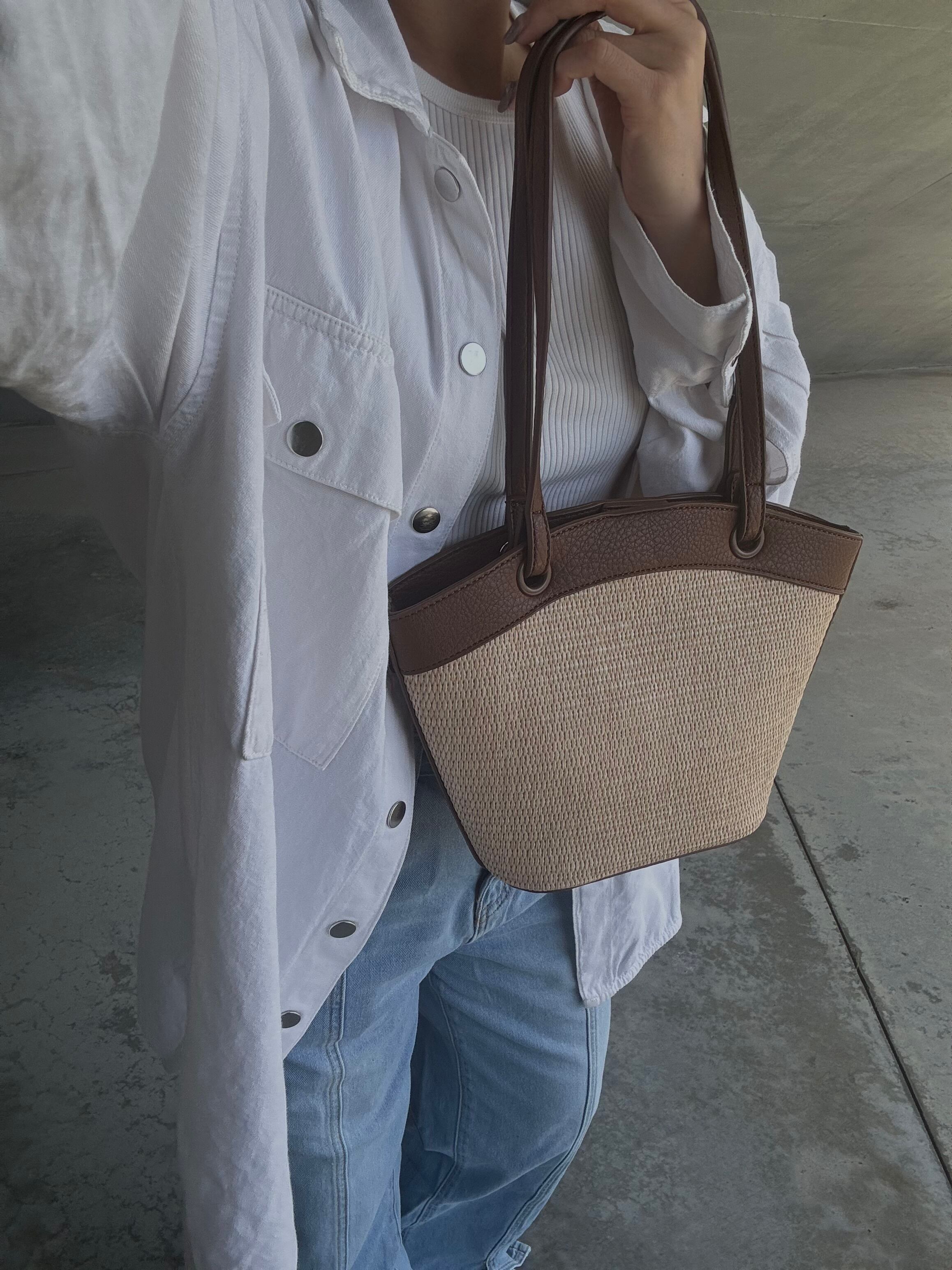 合皮素材と本体にはラタン・ラフィア素材をコンビネーションした、季節感たっぷりのショルダーバッグ。